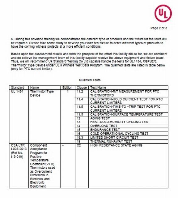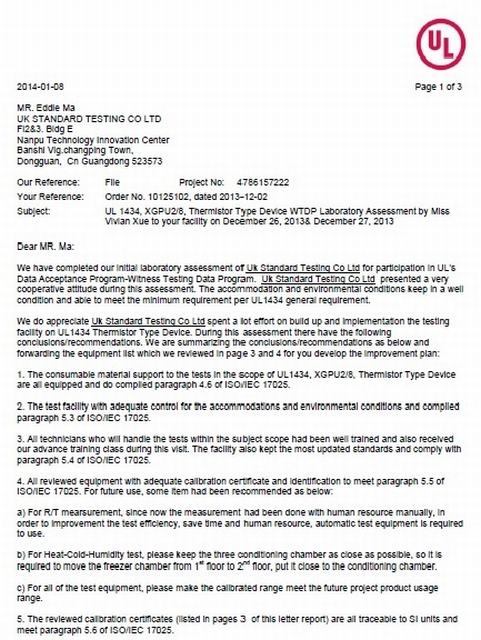 熱烈祝賀廣東優科檢測技術服務有限公司榮獲UL授予的UL1434熱敏電阻目擊實驗室,這也是大中華華南地區唯一獲得此殊榮的獨立第三方民營實驗室。