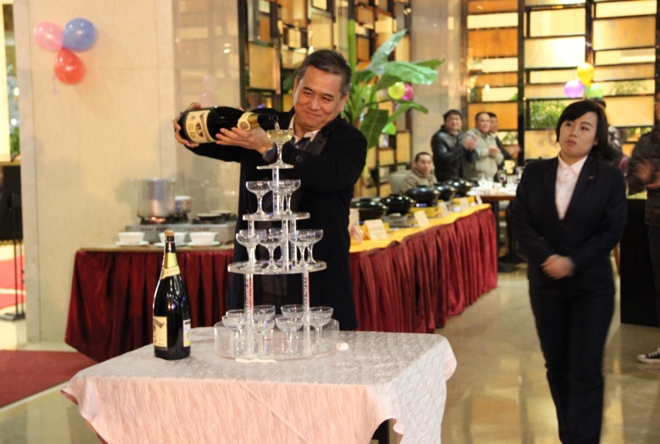 18點30分,年會正式開始。首先,東科集團總經理張玉女士致詞,和大家一起分享了董事長吳亮明先生高瞻遠矚,獨具慧眼,創建東科集團的歷程;總結了東科集團2015年所取得的優異成績。同時,代表集團對所有支持集團發展的領導和嘉賓以及全體員工的辛勤付出表示衷心的感謝,祝福東科集團在新的征程中不斷發展壯大,再創輝煌。隨后,東科集團董事長吳亮明先生開香檳注入香檳塔,舉杯和現場所有嘉賓共慶年會,相與祝福,祝福大家新年快樂,身體健康,工作順利!祝福東科集團興旺發達!明天更美好!